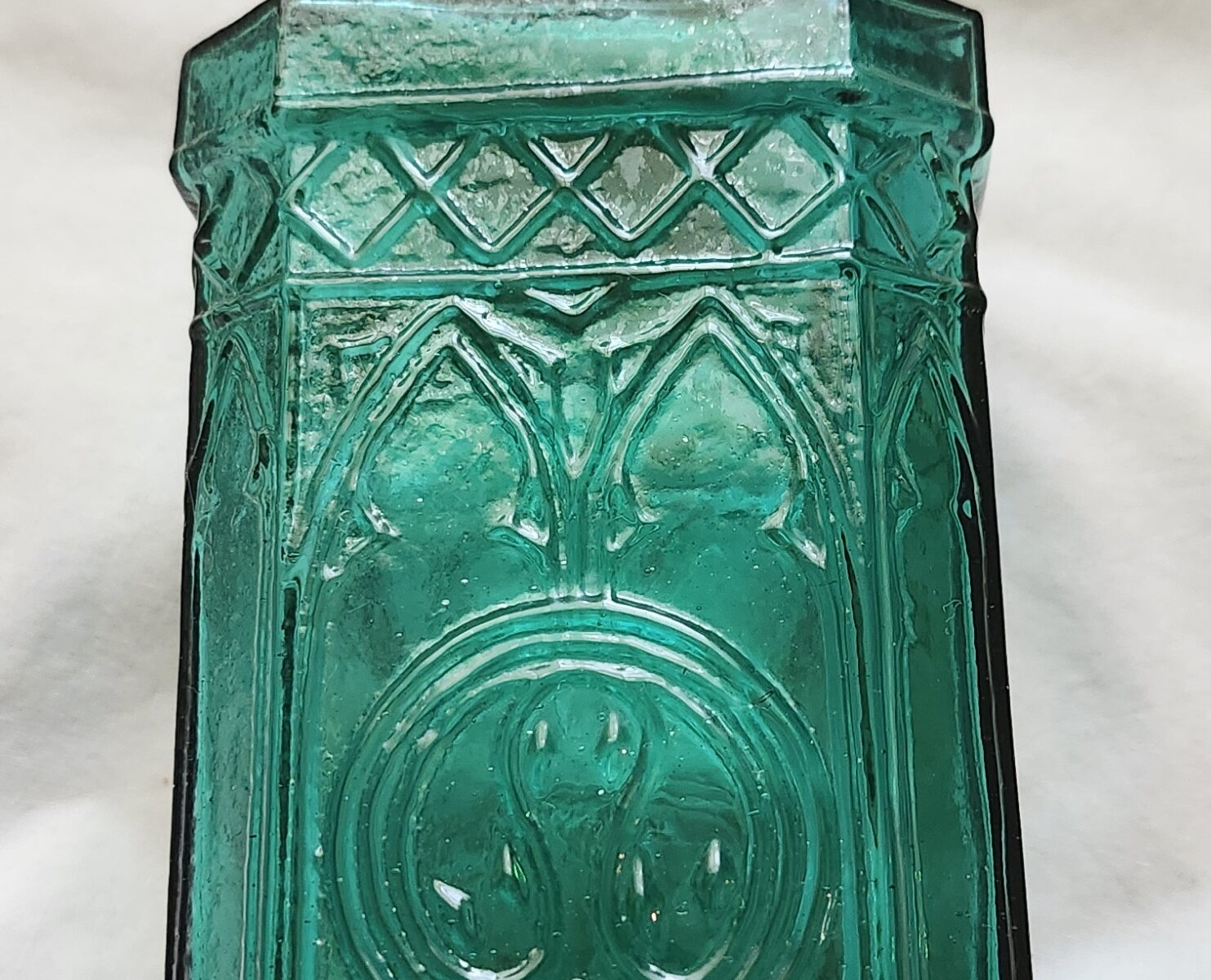 Vintage Teal Green Bottle/Decanter With Cork. Bottle is in very good used condition with no chips or cracks. Cork has a nick as shown in pictures. Stands 11 1/2 inches tall and base is 3 inches across. Unique designs. No markings as to manufacturer. Made in Spain. Color is a beautiful teal green. From the 1970’s. We ship by Canada Post.