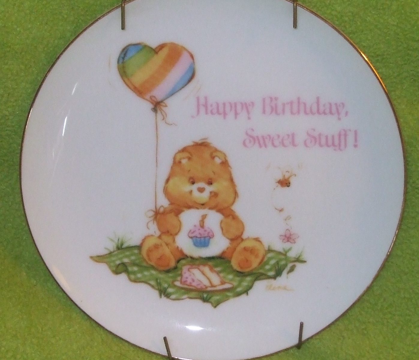 Happy Birthday Sweet Stuff Care Bear Plate from American Greetings 1983. Comes with plate holder. Made of fine porcelain. In good condition, no cracks or chips. We ship by Canada Post. Arrangements can be made for local pick up as well.