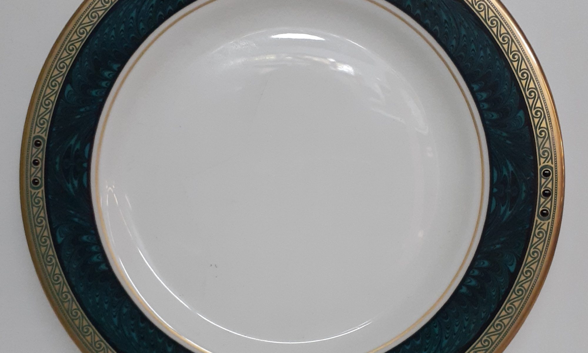 Bread and Butter Plate from Lenox in the Classic Edition Pattern. Fine Bone China. Made in the USA. Measures 6 1/2 inches across. Pattern was available from 1994-2004. This piece has never been used but has been in storage for a lot of years. Beautiful green marble band surrounded by gold trim with green scroll design then gold trim. Base is white. We ship by Canada Post.