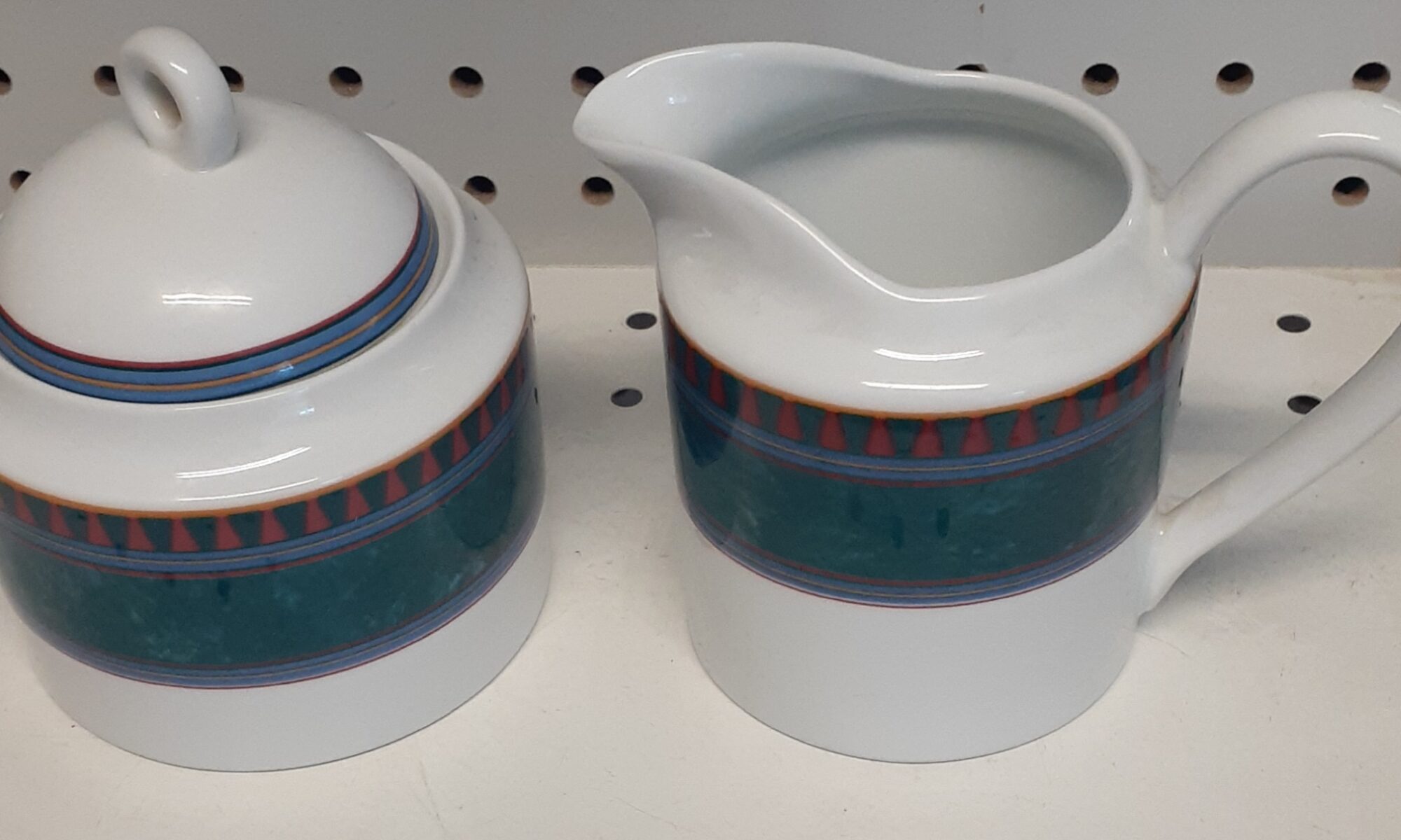 This set of creamer and sugar bowl with lid is by Mikasa in the La Scala pattern which was discontinued in 1995. Both have never been used still have original tags. Creamer is 3 3/4 inches high and 5 1/4 inches wide and holds 8 ounces of liquid. Sugar Bowl is 4 1/2 inches high and 4 1/4 inches wide opening is 2 1/4 inches across. White base with green band with red geometrical design, blue band surrounding a green marble design. decorated in the USA on Japanese fine china. We ship by Canada Post.
