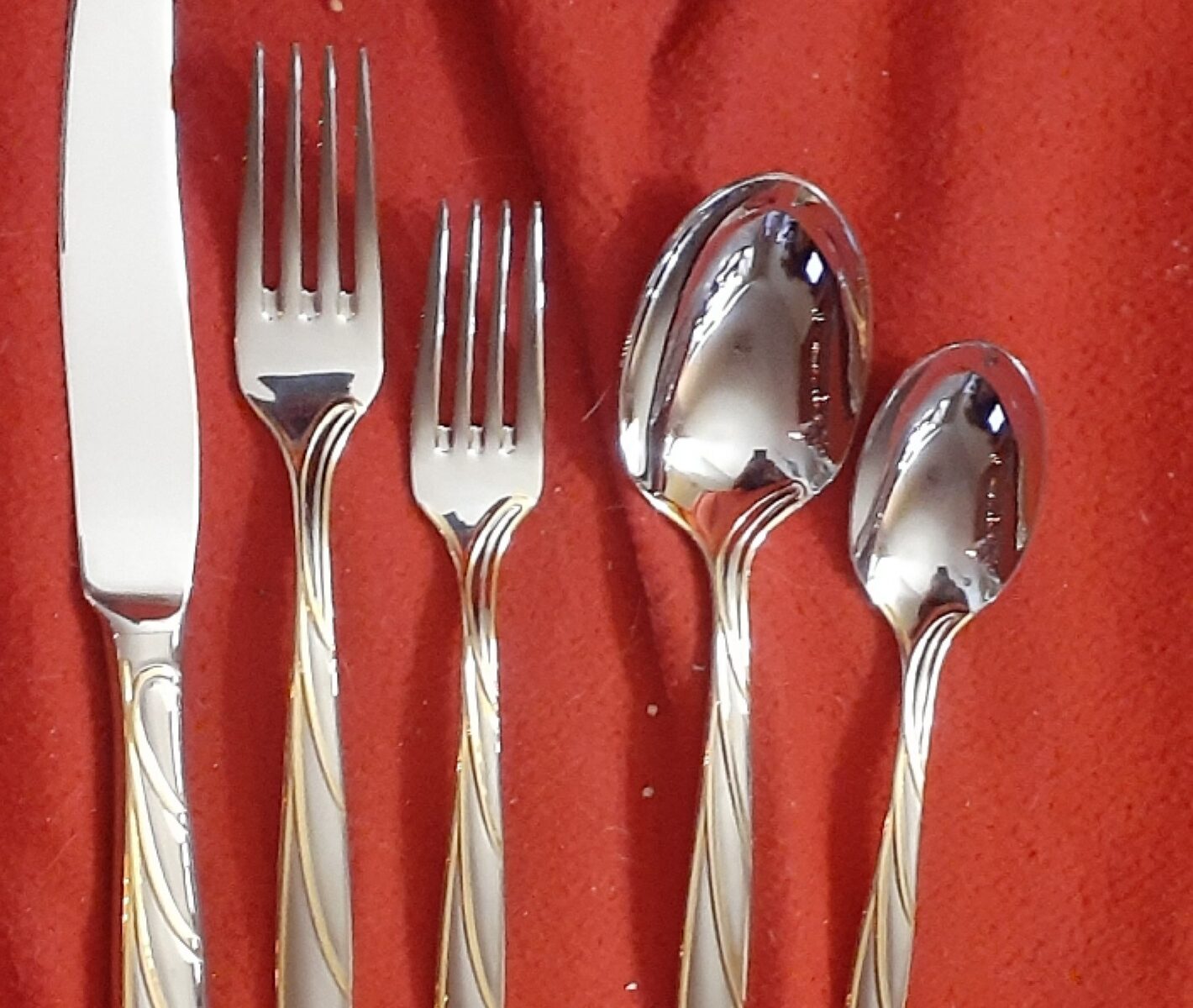 Mikasa 5 Piece Flatware Set in the Latitudes Gold Pattern. Set includes 1 french hollow knife 9 1/8″, 1 fork 7 7/8″, 1 salad fork 7 1/8″, 1 teaspoon 6 1/4″, 1 oval soup spoon 7 1/4″. Stainless steel, glossy finish with gold accents. Made in Korea, Pattern ran from 1995 to 2004. All are new have never been used. We ship by Canada Post.