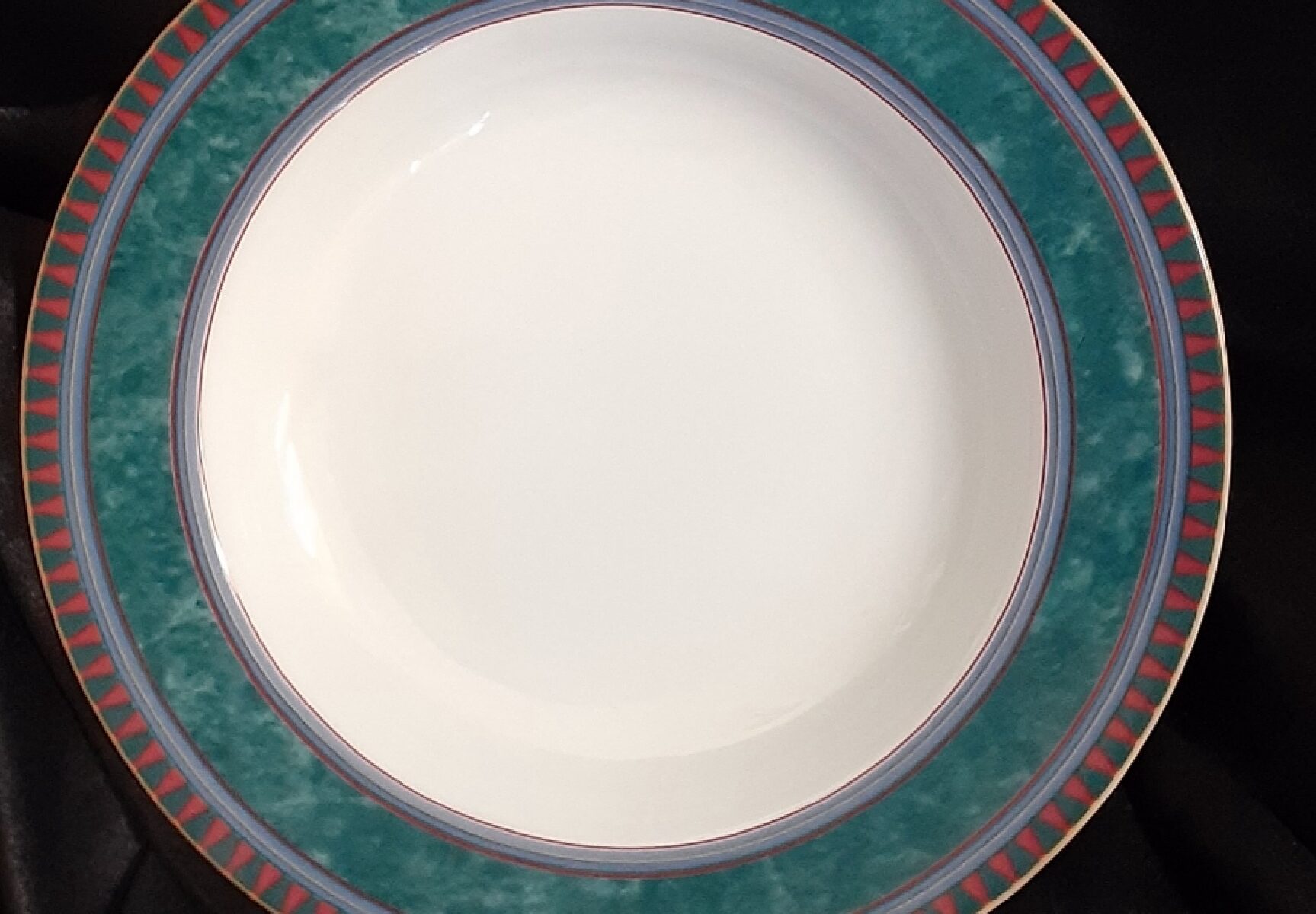 Mikasa California Soup Bowl in the La Scala Pattern M5111. Pattern ran from 1994 to 1998. This product has never been used. Green Rim with red , green and blue trim. Hi tech porcelain. Dishwasher, oven and microwave safe. Measures 8 5/8 inches across. We ship by Canada Post.
