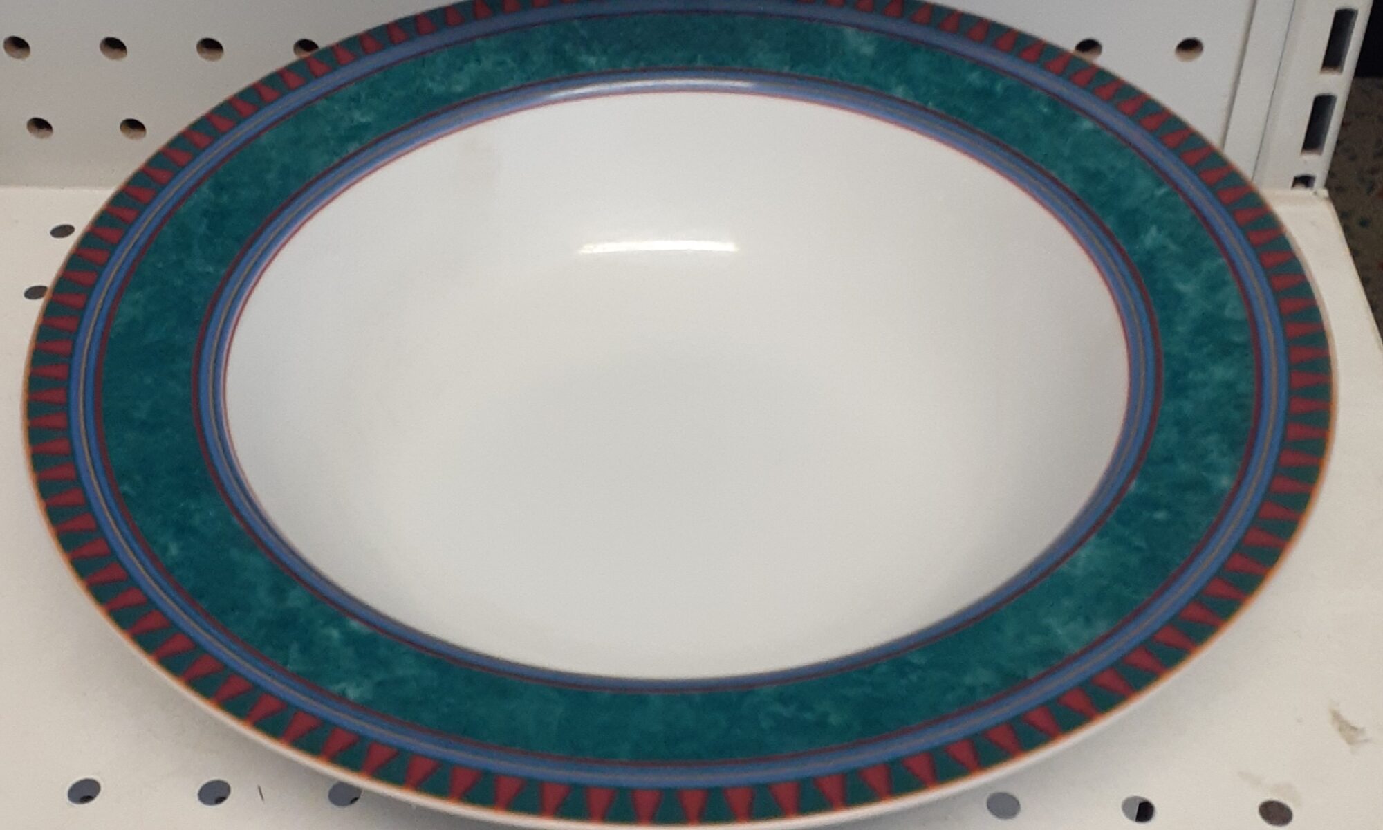 This beautiful vegetable bowl is by Mikasa in the La Scala Pattern which was discontinued in 1998. Measures 10 inches across from rim to rim and the bowl measures 2 3/4 inches deep. Rim is green with red geometrical design then blue trim surrounding green marble design. Inner bowl and out finish is white. Decorated in the USA on Japanese fine china. This item has never been used has original tags. We ship by Canada Post.